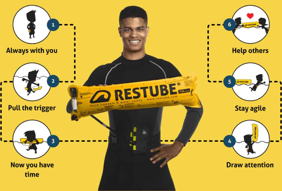 Restube is lightweight and ultra-compact drowning prevention device consisting of a rescue tube folded into a small pouch. It is worn around the waist or attached to a piece of equipment such as a kite surfing harness or Restube-ready wetsuit.